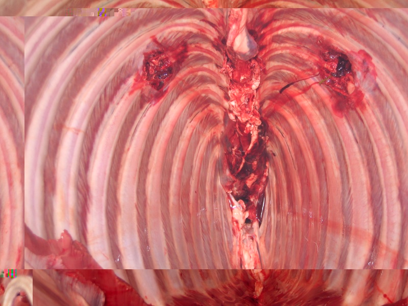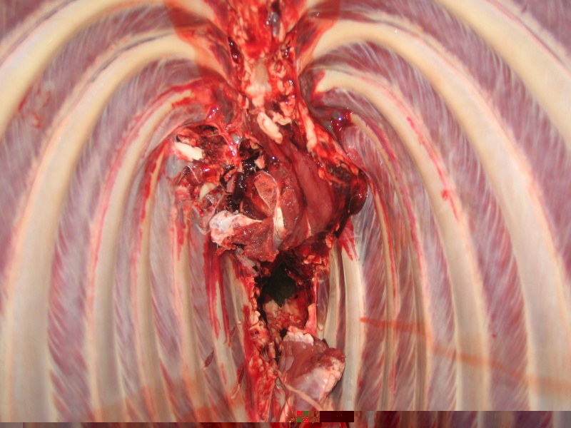 Þetta er klára lungnaskot en aðeins á ská, innskotið alveg aftur við þinden það sleppur engu að síður við gor, það hefði hins vegar ekki sloppið ef kúlan hefði farið hina leiðina út aftur við þind þá hefðu einhver brot farið aftur í vömb.
