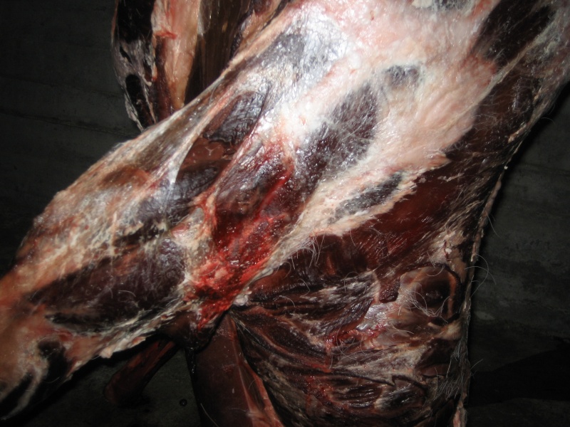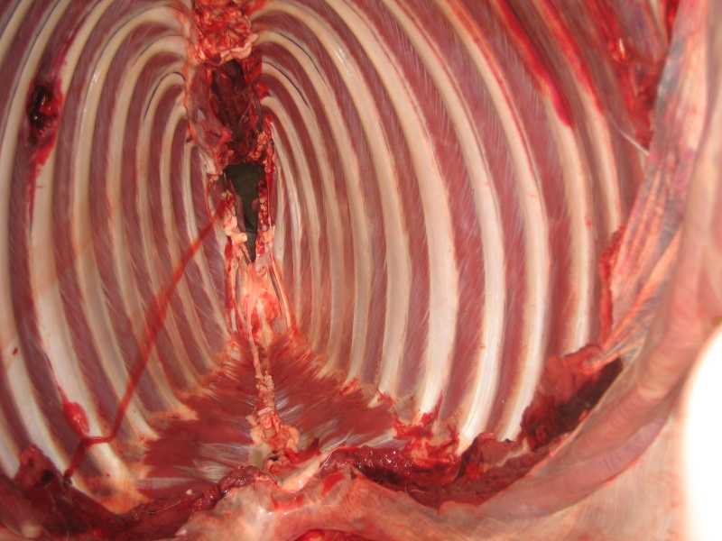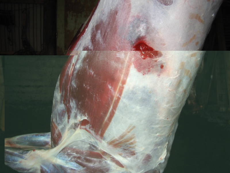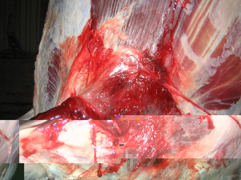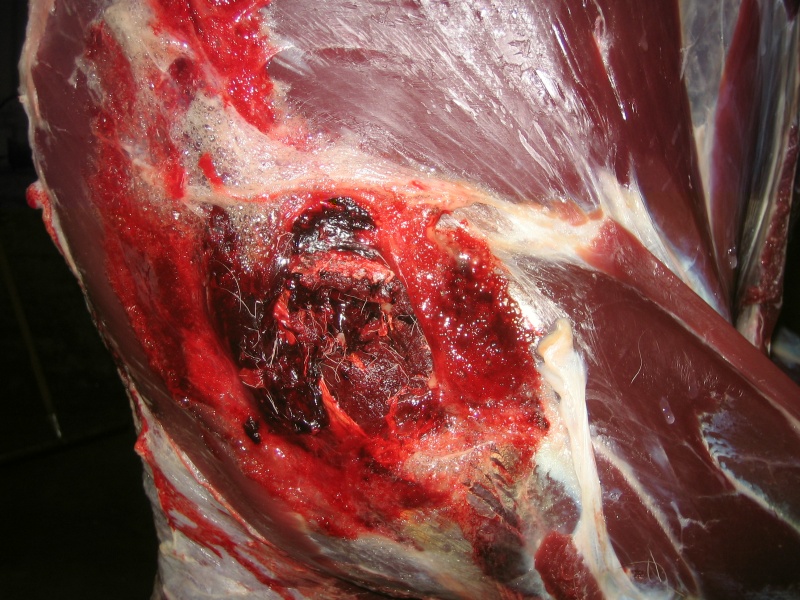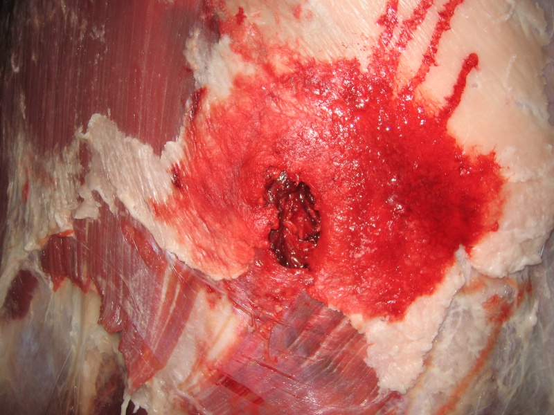Það sést líka á þessum myndum að Accubond kúlan er ekki að skemma neitt ef hún er sett á síðuna þar sem hún er þynnst, ef þessi kúla hefði hins vegar farið í bógbein hefðu orðið verulegar skemmdir á kjöti.
