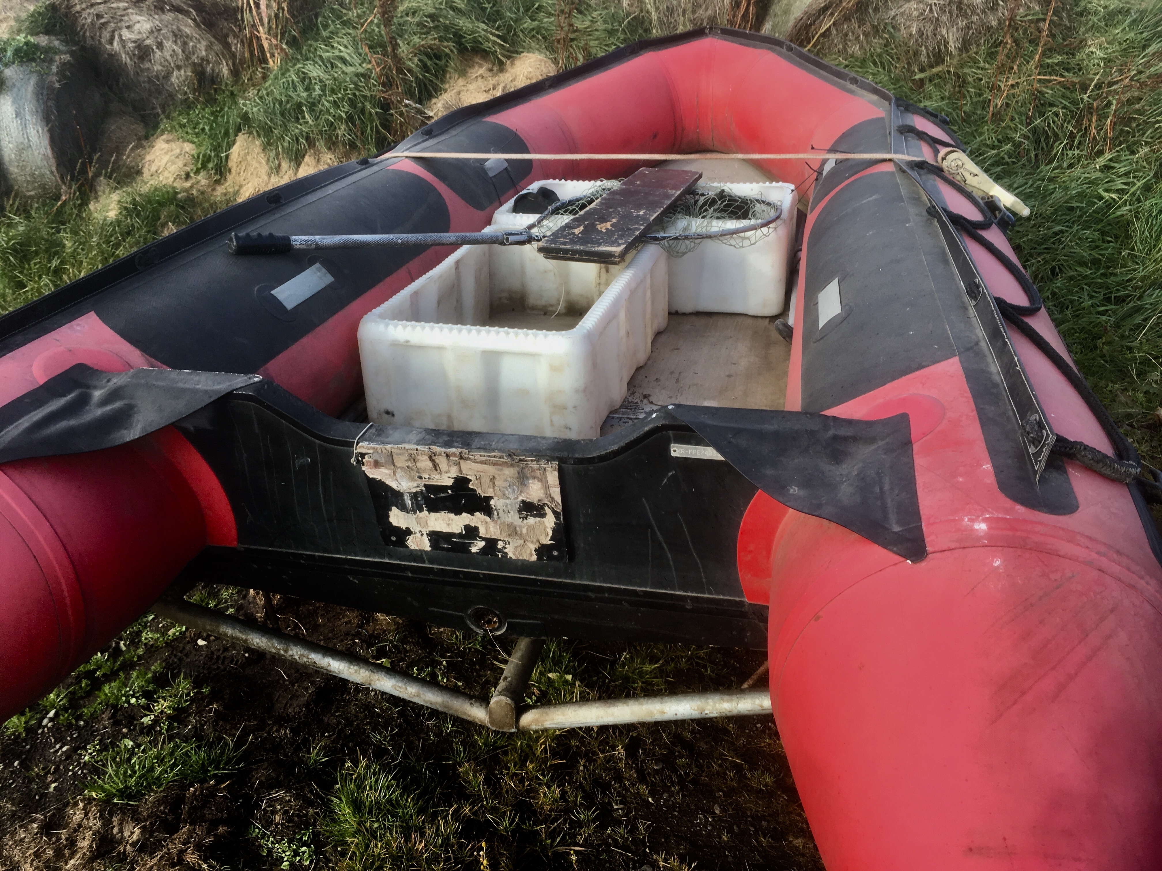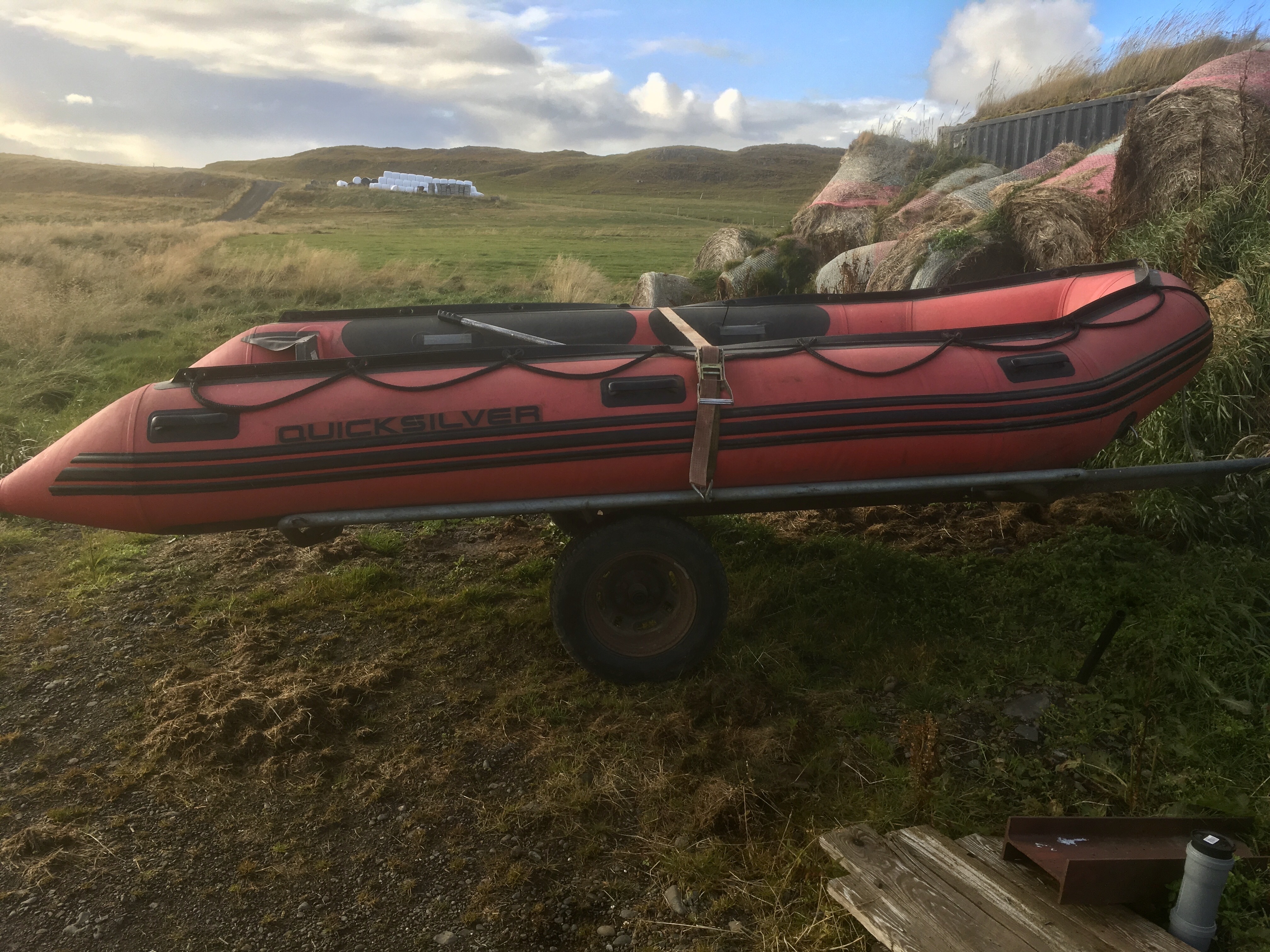 Bátur og kerra eru sirka 15 ára gömul. Slöngur halda vel lofti en kjölurinn þarf ábót reglulega.