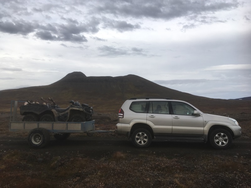 Þann 12. sept. hafði brugðið til betra veðurs, einn fárra sólardaga á veiðitímabilinu og einn tarfur á svæði eitt undir, samt rigndi þegar við vorum að koma tarfinum í bílinn.