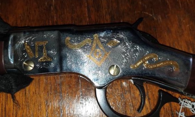 Þetta er virkilega fallegur riffill með inled grafin frímúrara tákn í 22 karata gulli á láshúsinu.