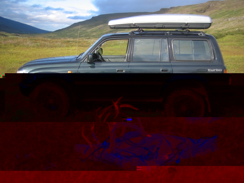 Var nú hringt á leigubíl sem að vísu var í öðrum verkum og kallaður til um 11 kílómetra leið að meiri parti eftir hálfgerðri vegleysu og kerru framan úr sveit sem sótt var 20 kílómetra til að bjarga nýja veiðibílnum frá þessum rauðgrana.