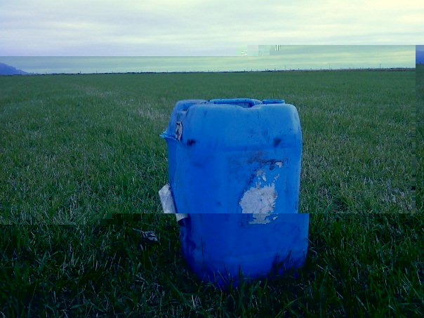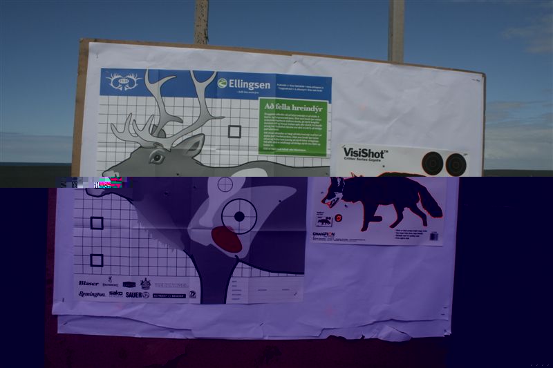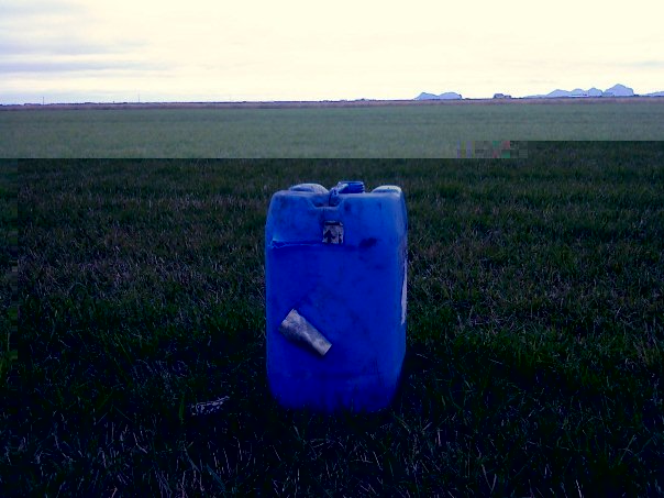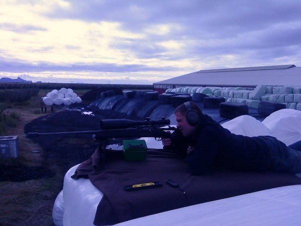 Og hérna eru myndir af skoti á 643 metrum síðasta haust. Í mjög góðum aðstæðum. Ég setti upp 20 lítra brúsa og mældi færið með GPS 643 metra. Reiknaði svo fallið út og vindrekið en það var örlítill hliðarvindur. Kúlan fór utan í brúsan vinstramegin og klippti í sundur miðan og gerði örlítið gat en nóg til þess að ég sá vatnsgusuna þegar kúlan hæfði brúsann. Ég tel mig hafa gert ákveðna reikniskekkju og því ekki hitt brúsan í miðjuna en það er erfitt að segja það eftir á.