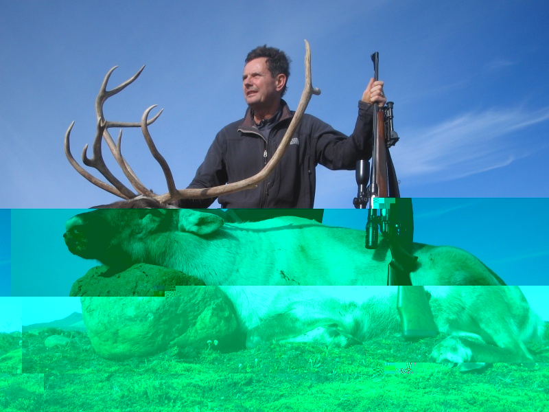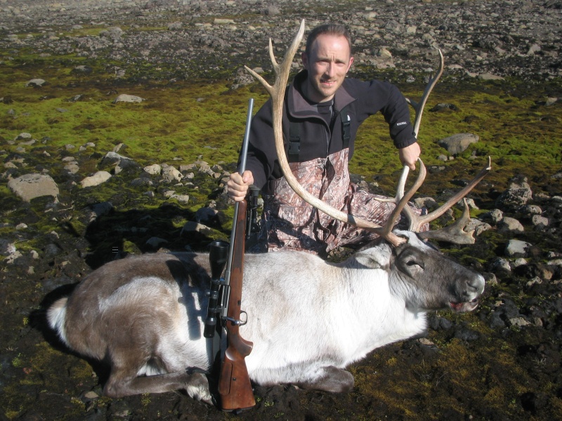 Í þetta skipti notaði ég Barnes TTSX kúlu í fyrsta sinn á hreindýr. Flott kúla sem grúppar vel í rifflinum mínum. Ég byrjaði mínar hreindýraveiðar á að hausskjóta en dýralæknir ráðlagði mér að lungnaskjóta dýrin frekar. Síðan hef ég lungnaskotið hreindýr enda er það skynsamlegt ætli maður að nýta kjötið. Með lungnaskoti er dýrið blóðgað um leið og það er fellt. Nú fór kúlan aðeins of neðarlega og tók í sundur æðarnar ofan við hjartað og braut bóglegginn sem frá sneri. Mér þótti tarfurinn of lengi að detta og sendi honum því annað skot ofar og þvert í gegnum bæði lungun. Þá steinlá höfðinginn.